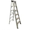 Escalera de aluminio tipo A de 7 peldaños, altura de 2,4 m y plataforma superior porta herramientas. Liviana, segura y resistente, soporta hasta 200 kg. Ideal para tareas de mantenimiento, pintura o uso doméstico.