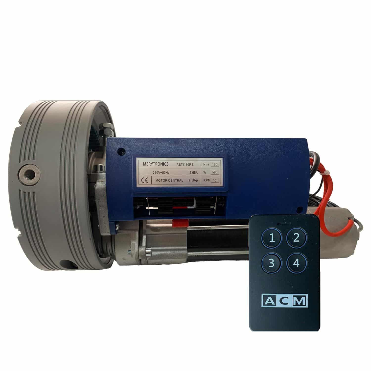 Motor central para cortinas metálicas de hasta 180kg. Con central incorporada. Marca MERYTRONIC línea ASTI. Con límite mecánico.